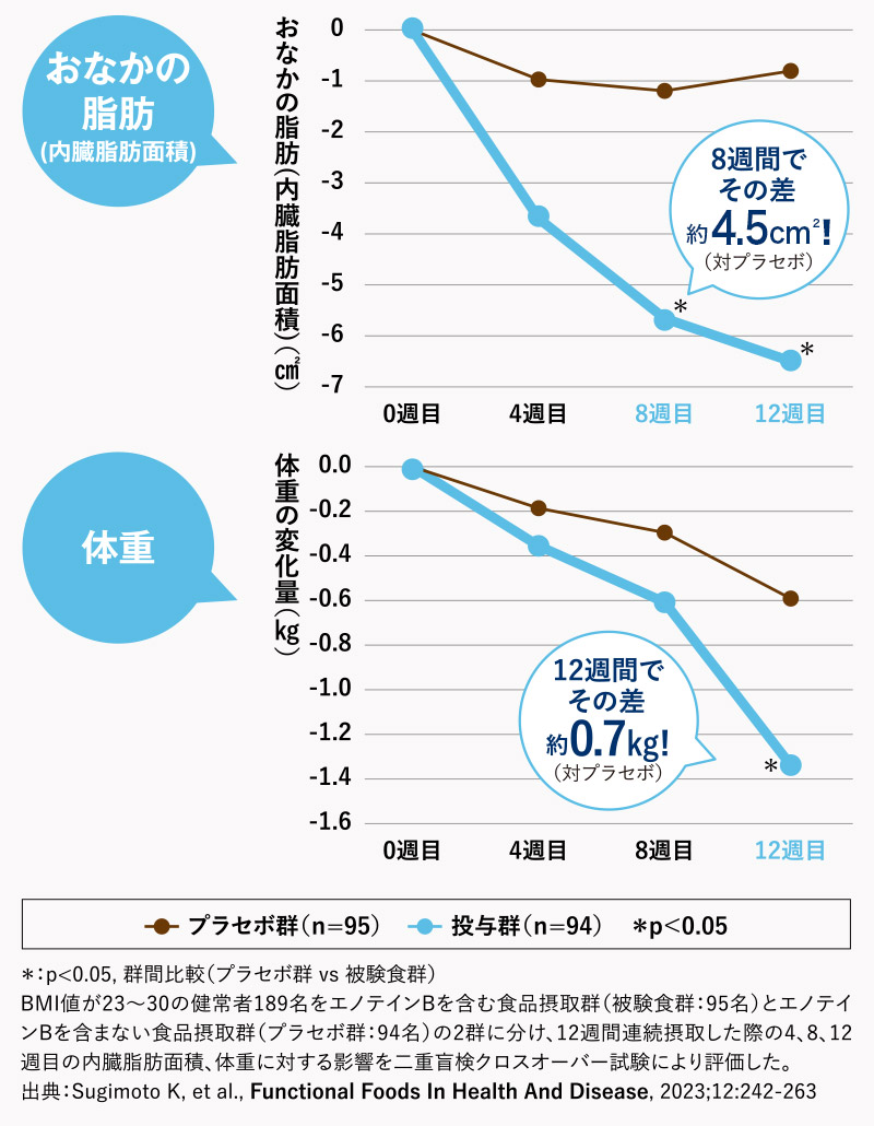 ※ユーカリ葉由来のポリフェノールであるエノテインBが、腹部の内臓脂肪を減少させ、体重の減少をサポートすることで